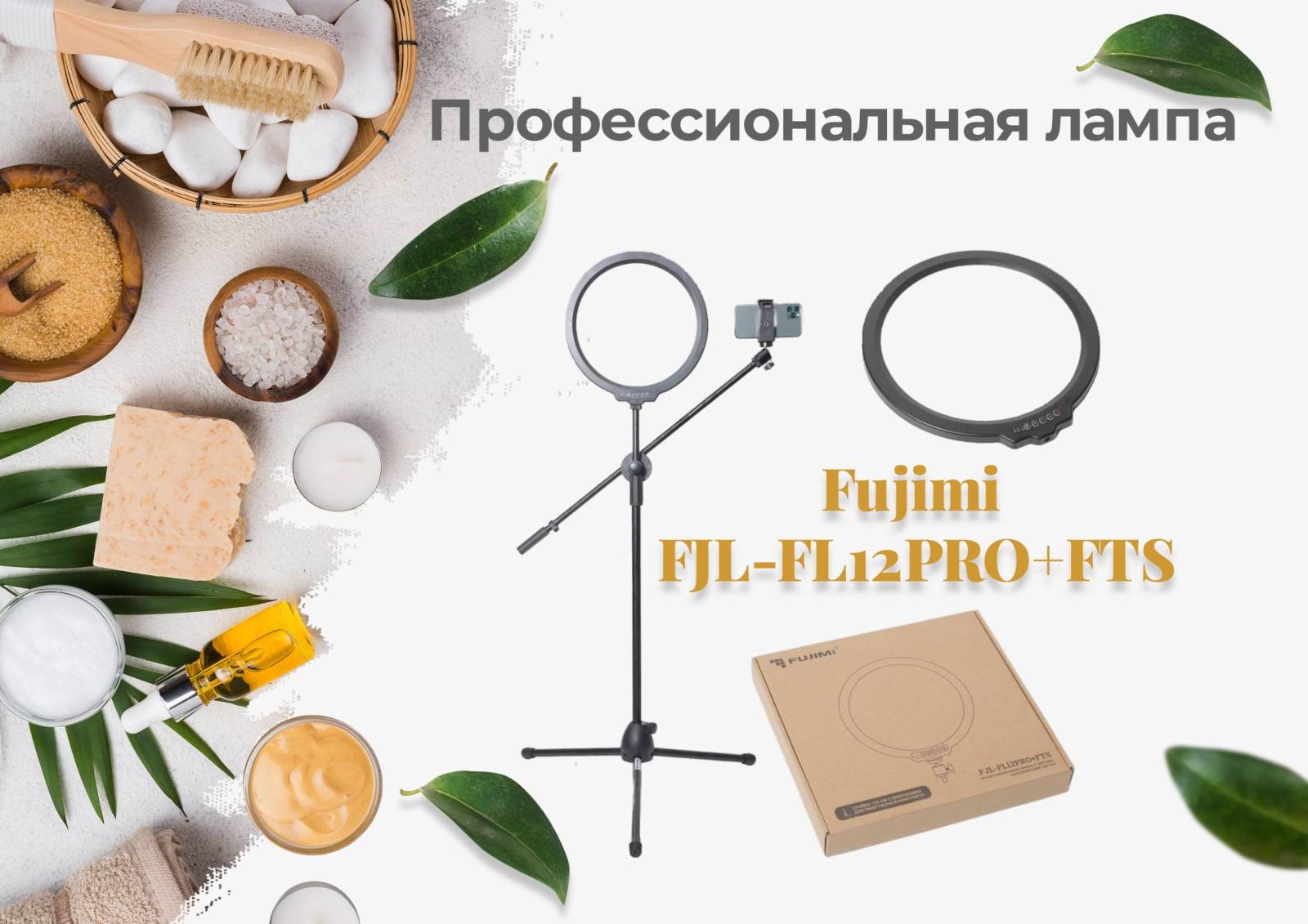 В комплекте с лампой диаметром 12 дюймов, идет напольная стойка с максимальной высотой в 133 см и креплением под смартфон. Это позволяет осуществлять высококачественную съемку, при этом не занимая много места.